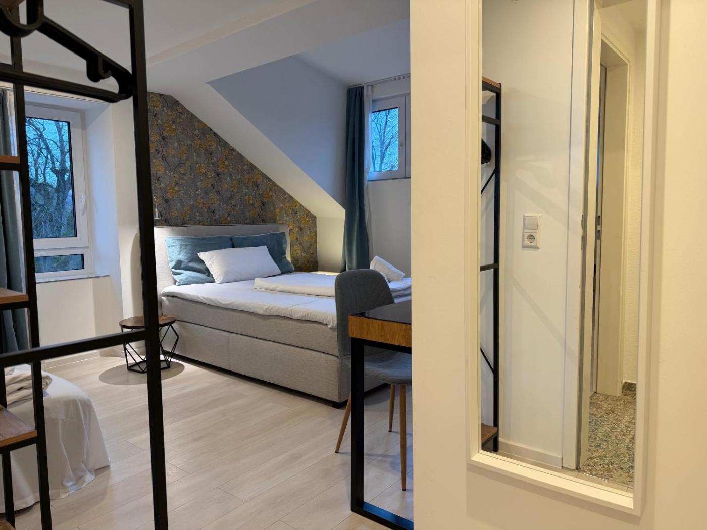 Doppelzimmer. The double room features a private entrance, a tea and coffee maker, as well as a private bathroom boasting a walk-in shower and a hairdryer. The double room provides a wardrobe, parquet floors, heating, a flat-screen TV, as well as city views. The unit has 1 bed. ;
